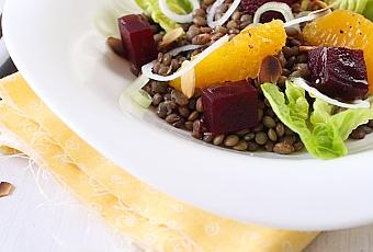 Rien de tel qu’une petite salade complète pour faire le plein de vitamines. J’ai mélangé des lentilles vertes, un coeur de sucrine (souvenez-vous, je vous en ai parlé ici), de la betterave, des amandes effilées et des suprêmes d’orange. C’est une salade colorée comme je les aime.