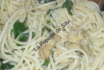 Dans un wok ou une grande poele , laisser revenir un peu l'huile d'olive et l'ail, ajouter les champignons, le coriandre , et ensuite les épinards (deja lavés et coupés), laisser revenir un peu et mélanger de temps en temps, une fois les épinards cuits, on ajoute les pâtes , on mélange bien ,puis on ajoute les herbes de provence qui donnent un tres bon goût .