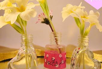 Voilà comment j'en suis venue à transformer des flacons de vernis en mini-vases. J'ai récupéré des flacons de vernis trop vieux ou finis. Pour les nettoyer, j'ai utilisé quelques gouttes de dissolvant (pas besoin d'en mettre beaucoup). On referme et on agite le flacon dans tous les sens pour bien enlever les vernis sur les parois. J'ai ensuite transvasé le dissolvant dans le flacon suivant et ainsi de suite. Après le dernier flacon, j'ai versé le mélange dissolvant/vernis sur du papier absorbant et hop dans la poubelle (pas dans l'évier hein!).