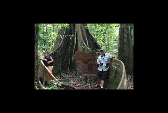Mercredi le 7 sept 2011- Une bonne journée nous attends. Nous allons tenter de marcher sur les canopées de la forêt amazonienne, écran formé par la végétation de la voûte de la forêt tropicale et ensuite aller visiter un refuge d'animaux. Après avoir passé une heure à la piscine après le déjeuner, la journée s'annonce belle et collante! C'est un départ pour environ une heure de pirogue avant l'arrivée à notre destination. Nous arrivons rapidement au site ou l'on doit grimper sur le dessus de la forêt. Petite marche d'une vingtaine de minutes dans la forêt humide, alors que nous croisons des arbres avec des racines d'une hauteur hallucinante! La forêt amazonienne ne cesse de nous surprendre à chaque détour!Après avoir pris quelques photos, nous reprenons notre marche et nous voici rendu a notre première épreuve, un pont de corde d'environ 100 pieds qui monte jusqu'a une plateforme située 13 mètres plus haut. Le pont ne semble pas très solide et se termine en penchant dangereusement vers la droite. Peu importe, tous les membres de notre groupe franchiront cette épreuve haut la main!