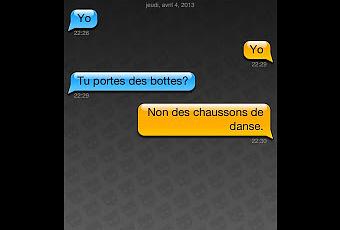 Illustration : pour les non initiés (non iPhonophiles, non smartphonophiles), il s'agit d'une fenêtre de discussion privée entre deux internautes(*) cherchant un compagnon de macramé1, Grindr2 étant l'application idéale pour nouer liens et fluides.