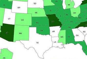 Classement par Etat : ceux qui accordent la possession et l’utilisation de marijuana à des fins médicales ou personnelles (vert clair), ceux qui sont en pourparler quant à la dépénalisation (vert moyen), les Etats qui ont dépénalisé et qui étudient encore les lois (vert foncé).