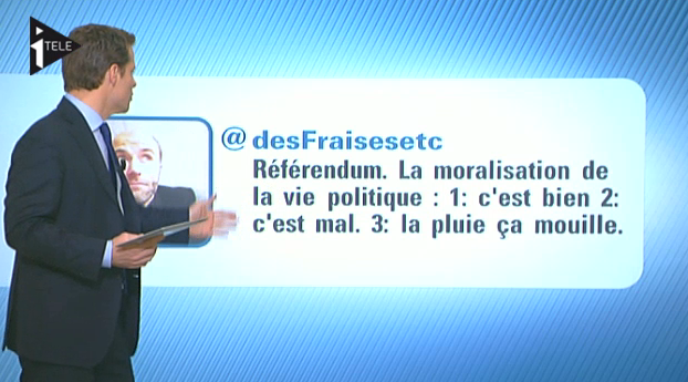 Référendum. La moralisation de la vie politique : 1. c'est bien. 2: c'est mal. 3: la pluie ça mouille.