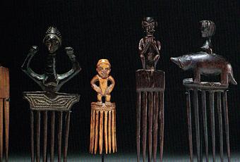 Ci-dessous, un peigne Ashanti. Le corps aplati laisse apparaître deux seins et les détails d'une riche parure : des motifs incisés et une amulette. La tête en forme de diamant surmonte un cou annelé. Parfois, sur d'autres peignes, celle-ci est inscrite dans une importante superstructure entièrement sculptée, illustrant dans ses innombrables raffinements toute la virtuosité de l'artiste.