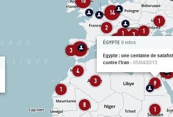 Le principe en est simple: la carte affiche le nombre d’articles correspondant à chaque pays, dans la période sélectionnée (24 heures, sept derniers jours, mois écoulé.).