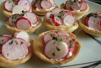 3/ Avec un couteau, placer un noix de philadelphia au centre. Couper très finement les radis et les placer sur la tartelette. Ajouter un peu de sel et de persil. Placer au frais pendant 20 minutes. C'est prêt!