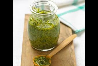 - Effeuiller la coriandre. Mixer les feuilles de coriandre avec l’ail, les noix, le sel, le poivre, le parmesan et 1 cuillerée à soupe d’huile d’olive jusqu’à obtenir une pâte homogène.