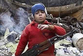 Le lieu: les décombres de la ville d'Alep en Syrie Costume et accessoires: Kalachikov en bandoulière, cigarette entre les doigts Acteur: Ahmed 7 ans fils dun combattant de l'armée Syrienne libre (non malheuresement! ce n'est pas une pièce d'au théatre ce soir et les décors ne sont pas de Roger Harth ni les costumes de Donald Cardwell)
