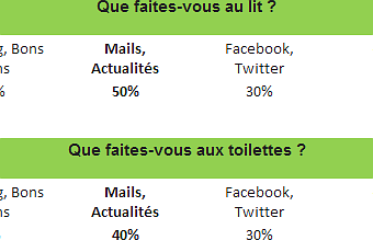 On apprend ainsi que le lit est l’endroit privilégié pour lire ses emails et s’informer sur l’actualité avec 50% des utilisateurs de smartphones totalement accros aux emails. Le petit-coin arrive quant à lui en deuxième place avec 40% de personnes avouant utiliser ce moment intime pour lire et répondre à leurs messages ! Enfin, presque 1 consommateur sur 2 utilise son mobile pour faire ses courses mais depuis son Bureau. Un résultat qui est plus important que la lecture d’emails ou les réseaux sociaux.