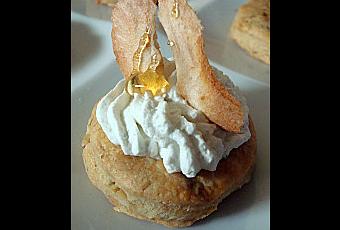 De délicieux sablés roquefort noix et une chantilly au roquefort surmontée de chips de poires et d'un peu de miel, miam !