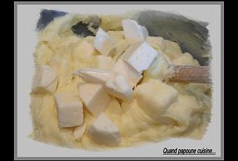 Ajouter petit à petit le fromage taillé en lamelles en prenant soin de soulever la purée de bas en haut afin d'étirer la préparation, jusqu'à formation d'un long ruban.