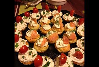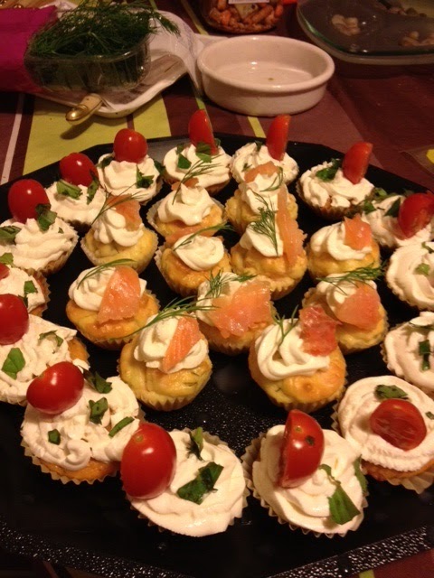 Ingrédients :125 g de farine1/2 sachet de levure60 g de beurre2 œufs60 ml de laitselpoivre250 g de St Môret***50 g de parmesan60 g de tomates confitesUne dizaine de feuilles de basilic5 à 6 brins de ciboulette{15 tomates cerises, feuilles de basilic, brins de ciboulette}ou120 g de saumon fuméAneth{saumon fumé, brins d'aneth}***Préchauffer le four à 165°C.Base des Cup Cake :Dans un saladier, mélanger la farine, la levure, le beurre fondu, les oeufs, le lait. Battre jusqu'à obtenir une texture lisse. Saler et poivrer.Pour la version tomates confites-basilic-parmesan, couper les tomates confites en petits cubes, ciseler le basilic et la ciboulette et incorporer le tout à la recette de base. Ajouter le parmesan et mélanger.Pour la version saumon fumé-aneth, détailler le saumon fumé en petits cubes, ciseler l'aneth et incorporer le tout dans la recette de base.Verser la préparation dans les caissettes en papier préalablement placées dans un moule à mini muffin afin qu'ils aient une jolie tenue.Enfourner 15 à 16 minutes à 165°C.A la sortie du four, laisser refroidir une trentaine de minutes.Remplir une poche munie d'une douille cannelée de St Moret puis dresser le topping sur chaque cupcake.Saupoudrer de graines de pavot et décorer de tomates cerises coupées en deux, de brins de ciboulette et de basilic pour la première version.Pour la seconde version, décorer de saumon fumé et de brins d'aneth.Et voilà le tour est joué... Bonne dégustation