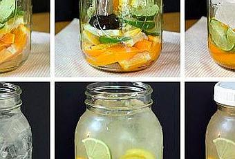 Procurez-vous des agrumes frais, ici du citron vert et des oranges. Coupez les en tranches que vous mettez dans un récipient. Pressez légèrement. Incorporez des glaçons selon votre convenance, de l’eau. Vous pourrez consommer le mélange obtenu dans les minutes qui suivent, et le repoduire chaque jour afin de vous aider à absorber la quantité voulue.
