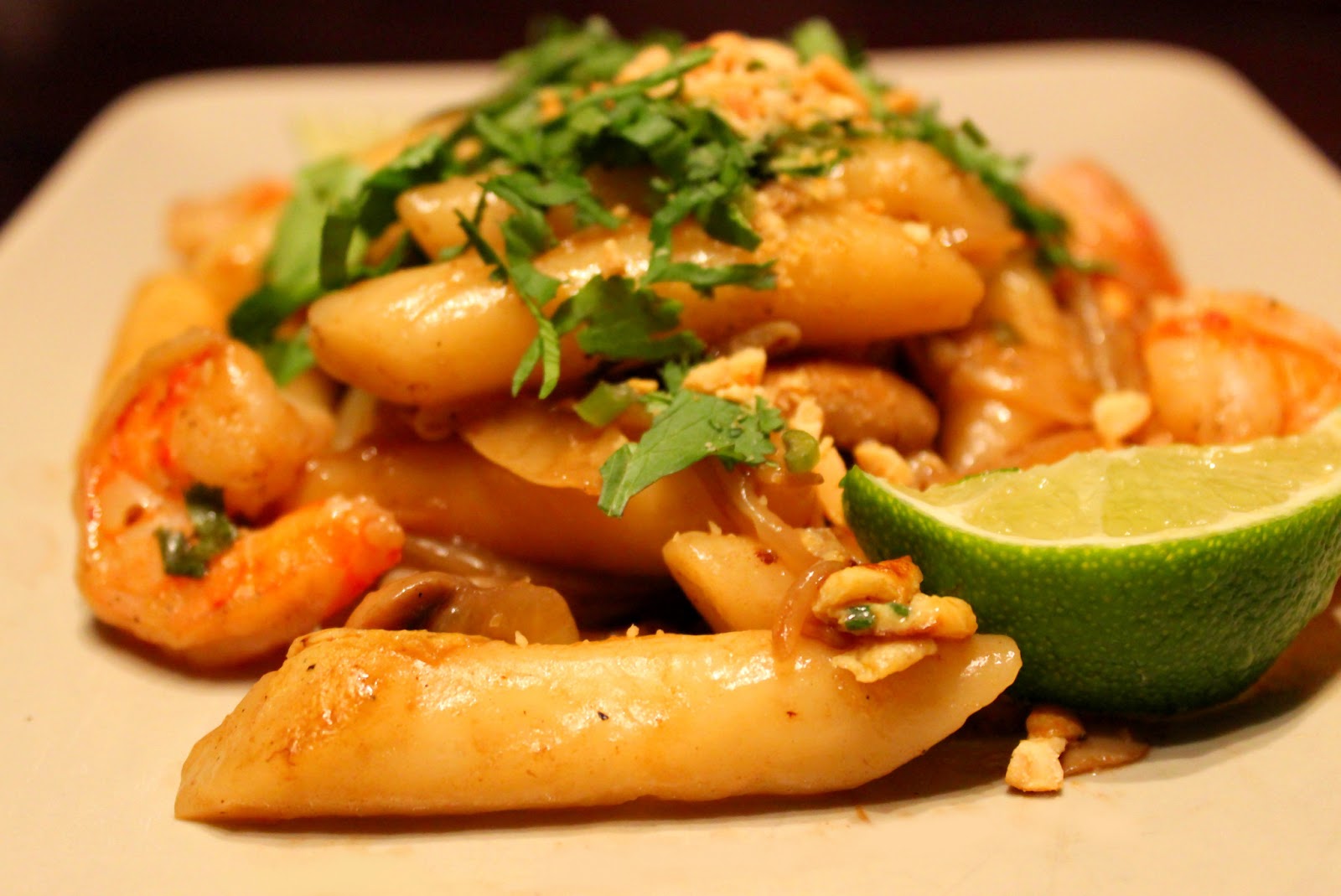 A ma gauche, les tapokkis au pays du matin calme.Tteokbokki, Topokki, Tokpoki-떡볶이 sont autant d'écritures différentes pour désigner ce plat populaire. Derrière ces noms, se cachent des quenelles de riz servies dans une sauce rouge à base de piment fermenté.C'est un plat très prisé en Corée du sud. Cette collation est souvent vendue par des marchands ambulants dans les rues coréennes qui vous permettent de manger, grignoter à toute heure.Du coup j'avais envie de mélanger ces deux plats. Je me suis dit que les quenelles de riz capteraient bien les parfums de la sauce du pad thai.