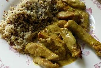 Ici, l'émincé de veau est servi avec du quinoa - ou boulgour - simplement cuit à l'eau bouillant salée 13 minutes. C'est délicieux !