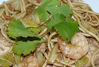 plat, nouilles chinoises, crevettes, poulet, huile de sésame, sauce soja