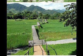 Un endroit perdu tout au Nord de la Thaïlande, au bord d’une petite route qui sinue le long du Mékong. Quelques bungalows, un potager qui fournit à la cuisine ce dont elle a besoin et surtout quelques tables ancrées sur une terrasse en teck face du fleuve.Tout y est délicieusement immobile, suspendu en dehors du temps et de l’espace, entre-deux, un peu irréel. Les collines qui ferment l’horizon sont celles du Laos, à portée de main, séparées par la masse d’eau qui s’écoule lentement et majestueusement.Je l’ai découvert à l’été 2007, au hasard d’une promenade solitaire et un peu mélancolique, au bord du Mékong.Occasion d’un arrêt à l’abri d’un des parasols pour y poursuivre, pendant quelques heures, la lecture d’A la Recherche du Temps Perdu. La lenteur, la beauté et les zooms infinis des mots de Proust ont rebondis alors sur ceux de ce paysage, résonance parfaite et improvisée.Deux ans plus tard, nouvel arrêt, mais cette fois prolongé. Quelques jours immobiles à profiter de ce calme. Découverte aussi l’autre rive de l’endroit : le Mékong d’un côté et sa majesté silencieuse, la rizière de l’autre et sa verdeur ondoyante.Sur celle-ci, une passerelle en bois, sente mimant les méandres d’un fleuve, mini-reproduction du grand frère opposé.Au bout de cette sente, quelques autres bungalows où j’ai laissé les jours passer.Encore deux plus tard, je suis revenu. Fasciné par le lieu, c’est plus d’une semaine que je me suis attardé… à ne rien faire à part lire, écrire, et regarder.Mon ordinateur s’est lui-même pris au jeu, devenant un miroir de ce que je regardais, reflet de l’eau et des lignes brisées de mon balcon. Confusion et fusion, effacement des limites.La pluie de la mousson était au rendez-vous, lessivant constamment tout ce qui se trouvait à sa portée et nourrissant la force du lieu, ce Mékong qui capte les énergies et les fournit en rebonds…Je sais que cette magie m’attend et que j’y retournerai… bientôt…(Rai Saeng Arun, 2 Moo 3 Baan Phagub Rim Khong 57140 Chiang Khong Thaïlande, http://www.raisaengarun.com)