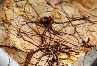 Ingrédients : 200g de sucre en poudre – 140g d'amandes émondées – 150g de blancs d'œufs – 170g de beurre – 60g de farine – 75g de chocolat noir fondu – 30g d'amandes effilées Pour décorer : 10g de chocolat fondu – 10g de Nutella Mettez le beurre dans une petite casserole et faites-le colorer noisette, attention à ne surtout pas le brûler, puis laissez refroidir.Mixez finement le sucre et les amandes entières. Versez les blancs d'œuf dans un batteur de battez-les rapidement surtout sans les monter en neige. Ajoutez le sucre aux amandes et battez bien. Laissez tourner votre batteur et versez le beurre ne filet. Ajoutez la farine et battez une dernière fois.Ajoutez alors le chocolat et les deux tiers des amandes effilées et mélangez rapidement à la cuillère. Versez votre pâte dans un moule couvert de papier sulfurisé, saupoudrez les amandes effilées restantes et enfournez pendant 25 à 30 minutes dans un four préchauffé à 180°.Quand le gâteau est cuit décorez-le en mélangeant le chocolat fondu et le Nutella. Si vous êtes joueur comme moi trempez un fouet dans ce mélange et faites tourner le fouet de manière à projeter le chocolat sur le gâteau… c'est joli mais vous risquez aussi comme moi d'être repeint au chocolat… sinon avec une cuillère c'est bien aussi !Mais pourquoi, après la chaleur la mousson… c'est logique ! est-ce que je vous raconte ça…