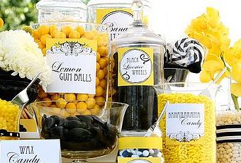 1. Tout d’abord, comme précisé dans la vidéo, choisissez un thème. Qu’il soit de couleur ou autre, choisir un thème vous permettra d’orienter et ainsi de préciser votre réflexion. Ci-dessous par exemple, un Candy Bar très réussi trouvé sur un blog américain avec le thème de couleurs jaune et noir.