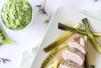 3- Accompagnez de la purée de petits pois et du beurre de sauge à déposer sur les morceaux de viande.
