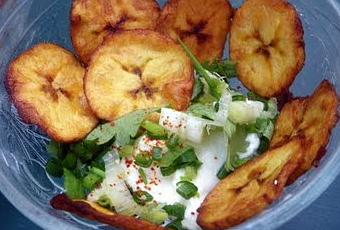 Ingrédient:Pour 4 coupes4 yaourts naturesUne botte de ciboulette( ou de ciboule)1gousse d'ail presséesel poivre piment( que l'on peut remplacer par du curcuma)Quelque pluches de coriandre ou de persil1 banane plantain (légume) mûreDe l'huile de fritureMettre une gaze dans une passoire fine et verser les yaourts dedans. Recouvrir d'un morceau de cellophane et laisser égoutter au moins 3 heures.Récupérer le fromage ainsi formé et mettre dans un récipient.Ajouter la ciboulette, le sel, le poivre, le piment mélanger délicatement mettre dans des coupes ou des verrines, décorer avec la coriandre et réserver au frais.Couper la banane plantain en fines rondelles avec une mandoline et faire frire dans de l'huile jusqu'à avoir une belle couleur dorée.Égoutter sur du papier absorbant , ajouter aux coupes de fromage et servir aussitôt.C'est délicieux! Le goût très subtil du fromage et l'agréable croquant des bananes(qui ont plus un goût de pommes de terre!)