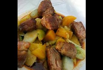 Nous avons choisi la pluma de porc ibérique Bellota-Bellota. Une révélation ! Le plat arrive sous cloche, sous la forme d'un sauté moelleux aux légumes (en particulier des choux de Bruxelles absolument fondants), des dés de cette partie du porc située en avant des lomos et enveloppée d'une fine cape de graisse. Un morceau rare puisque chaque cochon nourri exclusivement de glands et en plein air, qui pèse environ 160 kg, ne livre que deux plumas d'environ 200g chacune soit deux portions. Le goût est délicieux, j'ai déjà repéré où je vais pouvoir me fournir en cette marchandise extraordinaire (chez Byzance, bien entendu !)