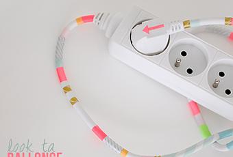 Ras-le-bol des rallonges qui traînent à même le sol, prêtes à jaunir aux moindres rayons de soleil…pas le choix c’est le moment de dégainer son masking tape (son scotch joli joli). On enroule, on entoure, on découpe, on colle bien… et c’est tout !!! Quitte à avoir sa rallonge sous le nez autant qu’elle soit belle.