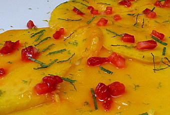 Tailler la mangue à la mandoline. Tailler les gariguettes en brunoise. Ciseler la menthe. Récupérer les zestes du citron vert.