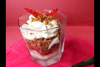 Ajoutez ensuite les miettes de speculoos. Une cuillère à soupe de crème. Enfin terminez par une demie fraise et quelques miettes de speculoos.