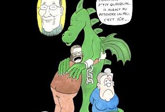 Mais ce que vous connaissez peut-être moins, et que j’ai eu le temps d’entrevoir au cours de la durée, hélas trop courte, où j’ai pu correspondre avec lui, c’est quel irremplaçable compagnon de jeu il était : je me souviendrai longtemps du pari qu’il avait fait avec une médium de nos relations, qui se reconnaîtra, de lui faire un dessin si l’une de ses prévisions se réalisait, ce qui s’est effectivement produit : s’est-il pour autant mis à croire à la voyance ou a-t-il simplement mis ça sur le compte d’une coïncidence comme ne manqueraient pas de le faire certains mauvais esprits un peu sceptique ? Toujours est-il qu’il a tenu parole, bien conscient qu’il avait mieux accepter de perdre un pari fait pour rire avec cette charmante personne, manifestant une probité et un esprit ludique appréciables. Il avait déjà eu l’occasion de faire montre de ces qualités en organisant le concours de dessins d’humour autour la rando VTT appelée « Dré dans l’darbon » auquel j’avais été moi-même invité à participer et qui consolidait son statut d’acteur culturel du pays savoyard ; et enfin, sur Fasseboque, il avait lancé un petit jeu dont je ne vous expliquerai pas le principe en détail mais que j’avais gagné, me permettant d’acquérir le plus beau souvenir que je pourrai jamais avoir de lui, matériellement parlant s’entend : un dessin original, celui d’une de ses plus savoureuses trouvailles parmi celles dont il parsemait journaux et sites internet…