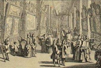 galerie du Louvre en 1699. Détail d’un almanach pour l’année 1700. Eau forte et burin, 88,8 x 55,8 cm. Paris, Galerie Terrades. © Galerie Terrades, Paris. »