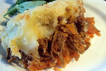 - Dans un plat à gratin : étaler la purée de carottes au fond. Déposer par dessus l'effiloché de porc et enfin étaler la purée de pommes de terre. Lisser.
