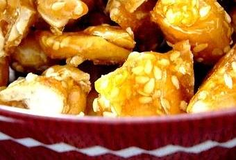 3. Versez les noix de cajou et les graines de sésame dans la casserole et à l'aide d'une cuillère, mélangez pour que les noix soient bien enrobées de caramel. Versez sur une plaque recouverte de papier de cuisson et détachez les noix. Les miennes sont restées attachées. Je les ai coupées aux ciseaux.
