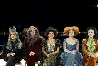 Sur les autres personnages, j'ai un peu plus de réserves: l'Arsinoé de Christèle Tual ne m'a pas convaincu, même si son entrée dans une sorte de char divin (fait de bric et de broc comme le reste) est assez réussie. Elle ne me dit rien et son costume défraichi un peu excessif des gens qui n'ont plus que le costume pour briller ne l'aide pas non plus (Cornelia Kirchhoff à la Schaubühne avait une autre allure, une autre tenue!). Les marquis Acaste et Clitandre jouent leur rôle avec efficacité (Stephen Butel en Acaste a de bons moments) dans une mise en scène où ils ne sont pas ridicules, mais des archétypes de courtisans, c'est à dire d'animaux de cour.