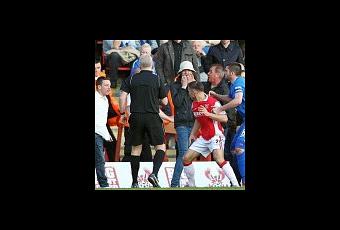 La rencontre a été arrêtée pendant une demi-heure en raison de l’envahissement d’une partie du terrain par des supporters de Stockport, certains d’entre eux n’hésitant pas à frapper des joueurs de l’équipe adverse.