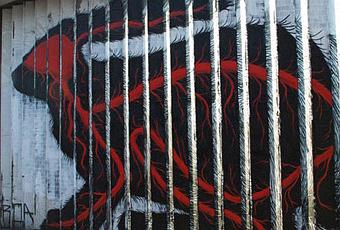 ROA, un blaze assez cours mais une histoire qui en dit long. En 2009, le gars avait frappé fort à Chicago avec ce rat tout bonnement énorme mais qu’on pouvait observer de deux façons sensiblement différentes. Vous pouvez maintenant admirer ce petit bijoux d’effet d’optique qu’il avait laissé sur Curtain Road à Londres. C’est assez malsain, mais la beauté du travail impose le respect de l’artiste.
