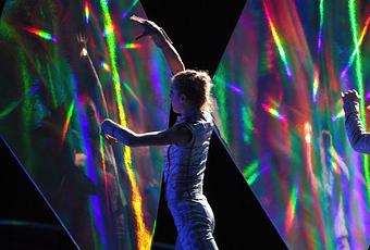La collaboration avec rosalie est fascinante. La décoratrice, peintre, sculpteur rosalie (sans majuscule) est la talentueuse créatrice de la scène et des costumes pour ce spectacle, elle articule les formes du fil narratif par des procédés qui, en collaboration avec Christian Kass, font souvent appel à la lumière et qui suivent une logique formelle qui favorise la lisibilité du spectacle. Les formes sont simples: des filins lumineux blancs et des losanges irisés ou colorés. Les losanges de la première partie reçoivent des arc-en-ciels irisés, ils sont posés sur leurs pointes comme des voiles qui entraîneraient des humains véliplanchistes vers des horizons plus lumineux, un avenir plus radieux. En deuxième partie, les losanges se retrouvent dans les sections des sculptures qui s'élancent de la scène vers le ciel. En troisième partie, le ciel est constitué d'un immense nuage de losanges colorés dans un camaïeu de bleus, comme si le ciel, qui a tendance à s'appesantir comme un couvercle, s'était reconstitué des losanges qu'avaient d'abord manipulé les humains, pour revenir les en menacer et les anéantir Au final, comme l'ourobouros, la boule de filins redescend vers l'humanité, mais leur blancheur s'est colorée de bleu, un cycle se termine, et rien ne sera plus comme avant. On pourrait longuement gloser sur le travail de rosalie comme sur celui de Kohler. Ici aussi, le parcours interprétatif nous échoit.
