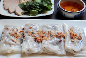 Retour au Vietnam avec un des plats populaires typiques du Nord du Vietnam : le bánh cuốn. Ce sont des raviolis vietnamiens, farcis à la viande de porc haché et aux champignons noirs et parsemés d’oignons frits, qui se dégustent chauds et arrosés de sauce nuoc mam préparé, accompagnés de lamelles de mortadelle vietnamienne (giò lụa ou chả lụa – connu aussi sous le nom de « pâté de porc » vietnamien), de germes de haricots mungo et de coriandre fraîche. Au Vietnam, on les mange au petit-déjeuner. Hors du pays et en Occident, ces raviolis vietnamiens s’invitent plutôt au déjeuner ou au dîner, en entrée.