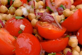 RÉALISATIONEgoutter les pois chiches, les verser dans un plat creux. Laver et sécher les tomates cerises, les couper en deux et les ajouter. Peler l’oignon rouge et le couper en fines lamelles, ajouter dans la salade.