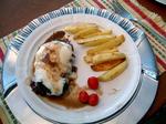 Poulet aux épinards: Si délicieux! Du poulet tendre recouvert d'une couche de confiture d'oignons rouges, d'un étage d'épinards verts et couronnés de fromage brie fondant. Un mariage de saveur exquis. Prenez-en une bouchée. Accompagnement: frites maison au four et tomates cerises Sous-assiettes argentée: Canico Import