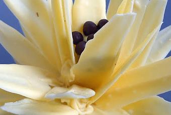 Voici une fleur de nénuphar entièrement faite en chocolat blanc.  On assemble les pétales un par un avec du chocolat blanc fondu et un aérosol refroidisseur pour obtenir cette délicate fleur qui peut servir à décorer un gâteau ou un montage chocolat.
