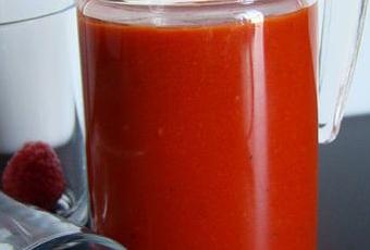 2 poivrons rouges, 300g de coulis de framboises, filet d'huile d'olive, sel, poivre, pincée de piment espelette, un trait de jus de citron, eau (jusqu'à consistance souhaitée).