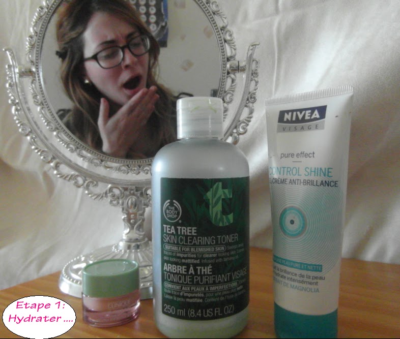 Dans un premier temps, on commence par hydrater la peau du réveil.A ce stade, j'adore les produits bien frais qui me permette de vraiment me réveiller de mon état léthargique du matin.Je commence à me nettoyer la peau avec mon Tonique de The Body Shop à l'Abre à Thé puis j'hydrate ma peau avec le contour des yeux Clinique et la crème hydratante Control Shine de Nivéa.