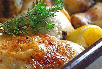 Préparation : Dans un récipient, mettre l'ail émincé, 3 c. à soupe d'huile, le jus d'un citron, le thym, sel et poivre. Mélanger. Dans un plat de cuisson, mettre l'oigno, disposer les morceaux de poulet dessus, répartir la marinade, placer 2 heures au frais.