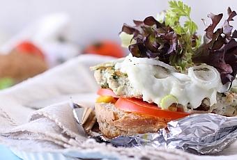 7- Coupez les buns en deux. Badigeonnez l’un des pains de moutarde Savora.