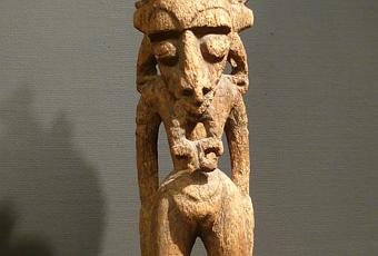 La sculpture du musée de Leyde est aussi passionnante d'une part pour son histoire puisque Nikolai Mikloucho-Maclay l'a observée in-situ dans une maison du village de Bongu en 1877, l'a décrite et dessinée (ci-dessous). Le Dr. Otto Finsch (qui fut probablement le premier Européen à remonter le Sepik), a remarqué cette statue lors de son expédition en Papouasie de 1884-85 et était certain que celle-ci existait depuis des générations.
