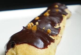 Pendant ce temps, fouetter les jaunes d'œufs avec le sucre (sans faire blanchir), puis ajouter la maïzena et mélanger à nouveau. Incorporer un tiers du lait bouillant au mélange jaunes d'œufs, sucre et maïzena, fouetter vivement, ajouter le reste de lait et fouetter à nouveau. Reverser le tout dans la casserole et faire cuire la crème sur feu vif en fouettant énergiquement sans vous arrêtez. Dès que la crème épaissit, retirer la casserole du feu et verser la crème dans un saladier, recouvrir de film alimentaire et laisser refroidir au réfrigérateur.2) Confectionner la pâte à choux : Préchauffer le four à 180°C. Dans une casserole, verser l'eau, le sucre, le sel, le beurre coupé en morceaux et faire chauffer sur feu moyen. Dès le premier bouillon, retirer la casserole du feu et verser la farine en pluie tout en remuant durant 30 secondes afin de dessécher la pâte. Remettre la casserole sur le feu et remuer énergiquement durant 2 min sans discontinuer jusqu'à ce que la pâte soit bien lisse et se décolle des parois de la casserole. Laisser refroidir.3) Hors du feu, incorporer les œufs un par un, tout en mélangeant énergiquement avec une spatule.4) Remplir une poche à douille. Réaliser des boudins de 12 cm de pâte sur une plaque en les espaçant de quelques centimètres. Enfourner pendant 30 mn à 180°C dans le four non ventilé (il est important de ne pas ouvrir le four, sinon la pâte s'affaisserait). Lorsque les éclairs sont cuits, les poser sur une grille et laisserrefroidir. 5) Monter les éclairs : Sortir la crème pâtissière du réfrigérateur. La travailler au fouet afin de l'assouplir. Ajouter le chocolat fondu et mélanger. Faire 3 trous sous les éclairs puis les remplir de crème pâtissière à l’aide d'une poche à douille.6) Réaliser le glaçage : Faire fondre le chocolat au micro-ondes, incorporer le beurre et lisser la préparation à l'aide d'une spatule. Ajouter le sucre glace, mélanger puis délayer la préparation avec l’eau. Lisser la crème obtenue et tremper rapidement chaque éclair. Parsemer de pépites de nougatine et réserver au réfrigérateur quelques heures afin que le glaçage se solidifie.Cette recette est issue du livre "PÂTISSERIE" de Christophe Felder. Vous trouverez le chocolat noir ébène à 72% de cacao sur le site chocolat Weiss.Merci à Barbara de Gastronomiz pour la Boîte à miam d'avril dans laquelle j'ai reçu les pépites de nougatine et la douille pour faire les éclairs.