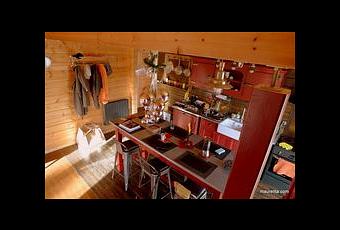 Sur un mur de fond et un sol teintés en noir, les meubles de cuisine rouges et leur dessus en zinc tranchent bien. Le rouge du poêle à bois et les escaliers de la mezzanine qui reprend le rouge des meubles créent une unité, avec une séparation virtuelle des espaces au sol : on passe de la réglisse en cuisine au chocolat au salon.