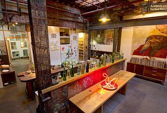 Mi loft-entrepôt, mi atelier d'artiste, mi chambre d'hôte, m musée, je ne sais pas vraiment comment qualifier cet endroit hors du commun à Brooklyn ! Si vous cherchez à passer une nuit atypique dans un quartier branchouille et animé de NYC, que vous n'avez rien contre la colloc, et que vous cherchez à développer votre esprit créatif, alors, c'est sûr, le Kellam wonder factory est l'endroit qu'il vous faut ! Un vaste espace, de la récup en veux-tu en voilà, une vaste cuisine, un salon de conversation, un lit mezzanine niché au-dessus d'un escalier fabriqué à partir de chaises anciennes empilées, un dépotoir à guitares.... la vie d'artiste quoi ! Ici, c'est quelques demi-douzaines d'artistes et autres producteurs qui vous acceuilleront et vous feront vivre une expérience hors du commun !