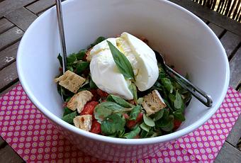 N’ayant pas de concombre et encore moins d’oignons rouges, j’ai décidé de faire avec les moyens du bord en incorporant tous les ingrédients qui permettent à mon sens d’atteindre la quintessence de la salade parfaite : de la mâche, du basilic, des cébettes, des tomates cœur de bœuf, de l’huile d’olive, des croutons de pain de campagne grillé et surtout, surtout de la BURRATA.